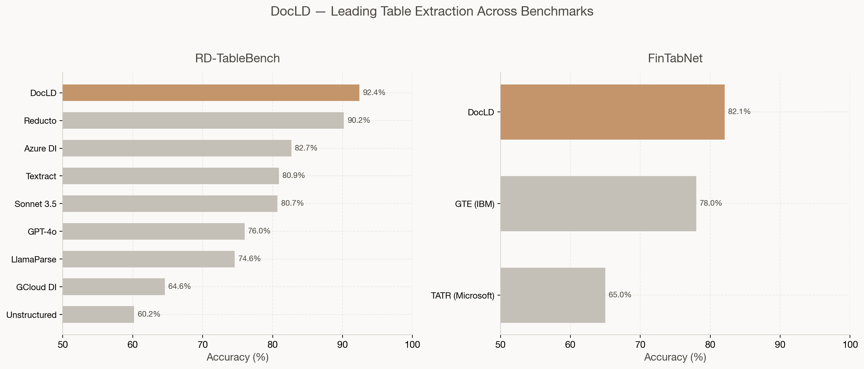 On RD-TableBench (1K diverse tables), DocLD scores 92.4%. On FinTabNet (500 financial tables), DocLD scores 82.1% with a 100% extraction success rate. The difference reflects FinTabNet's focus on financial documents — which have unique challenges like dense numeric layouts and non-standard formatting — and the different evaluation datasets.