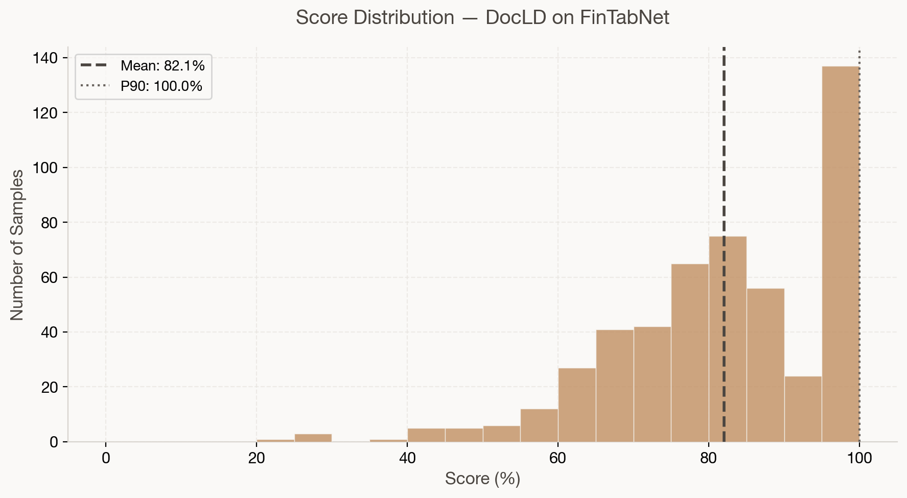 The per-sample score distribution shows strong consistency: the majority of tables score between 75% and 95%, with a tight cluster around the mean. The P90 is 99.7%, meaning the top 10% of tables are extracted near-perfectly.